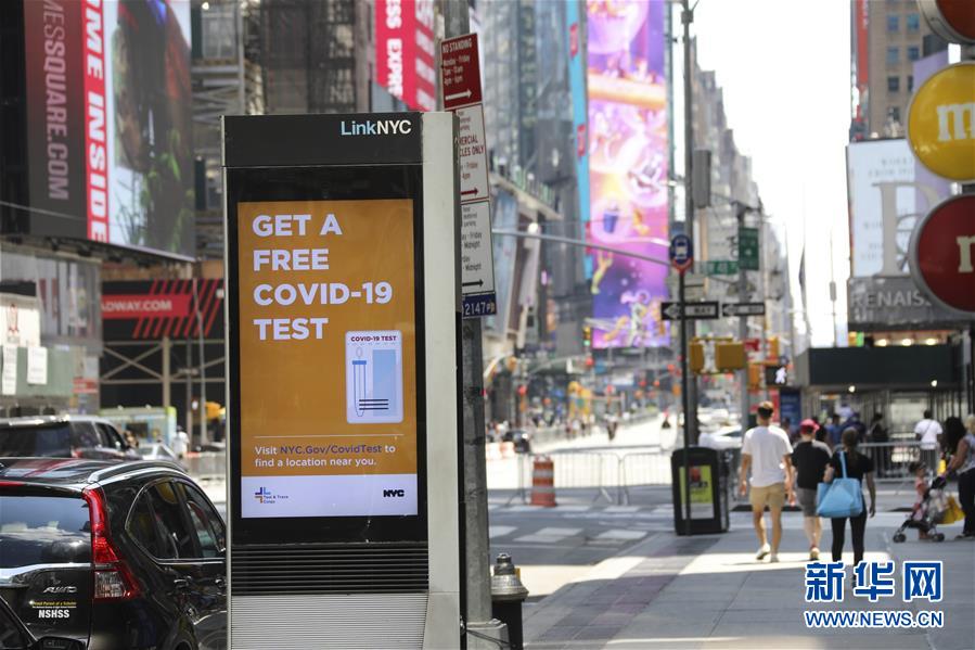 這是7月4日在美國紐約時報廣場附近拍攝的顯示新冠檢測信息的顯示屏。當(dāng)日是美國獨立日,美國多地疫情仍面臨嚴(yán)峻形勢。美國約翰斯·霍普金斯大學(xué)實時統(tǒng)計數(shù)據(jù)顯示,美國累計新冠確診病例4日已超過280萬例。新華社記者王迎攝