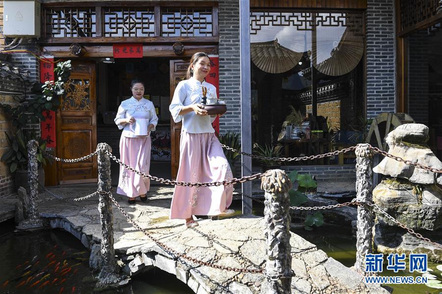 7月4日,服務(wù)員在廣西陽(yáng)朔一家民宿內(nèi)忙碌。她們是陽(yáng)朔縣陽(yáng)朔鎮(zhèn)的村民。新華社記者曹祎銘攝