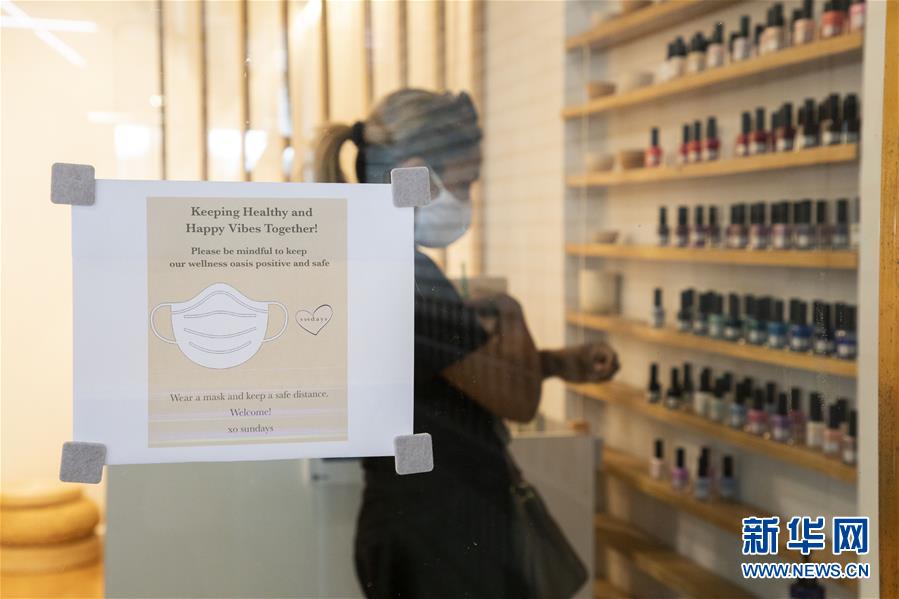 7月6日,顧客在美國紐約一家美甲店挑選指甲油,店門上貼著佩戴口罩進店的提示。當(dāng)天,紐約進入重啟第三階段,美甲店、按摩店等個人護理業(yè)在經(jīng)歷近4個月的停業(yè)后被允許重新開放。因防疫需要,原本應(yīng)在第三階段開放的餐飲業(yè)室內(nèi)就餐仍處于暫停狀態(tài)。新華社記者王迎攝