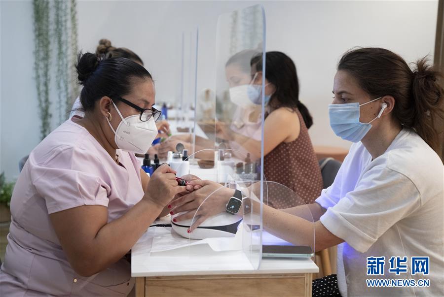 7月6日,技師在美國紐約一家美甲店為顧客美甲。當(dāng)天,紐約進(jìn)入重啟第三階段,美甲店、按摩店等個(gè)人護(hù)理業(yè)在經(jīng)歷近4個(gè)月的停業(yè)后被允許重新開放。因防疫需要,原本應(yīng)在第三階段開放的餐飲業(yè)室內(nèi)就餐仍處于暫停狀態(tài)。新華社記者王迎攝