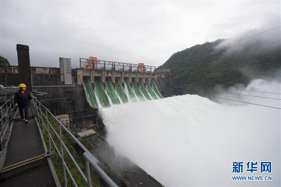 7月8日,新安江水庫開啟9孔泄洪,工作人員在新安江電廠開關站上進行設備巡查。新華社記者翁忻旸攝