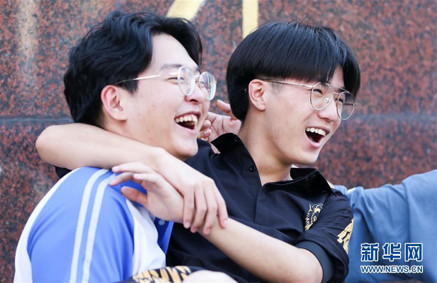 7月8日,在吉林省長春市第八中學(xué)考點門口,考生慶祝高考結(jié)束。當(dāng)日,全國部分地區(qū)2020年高考結(jié)束。新華社發(fā)(顏麟蘊攝)
