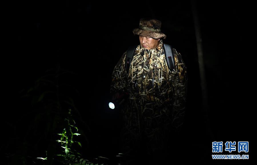 董紅雨在迎春林業(yè)局有限公司施業(yè)區(qū)內(nèi)進(jìn)行野生東北虎信息搜集和夜巡工作(7月8日攝)。新華社記者王松攝