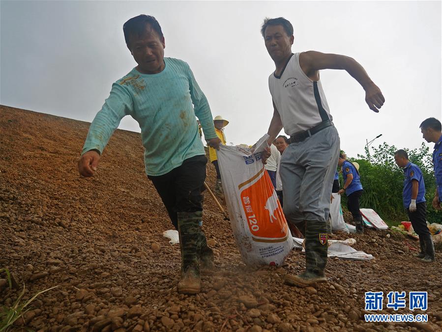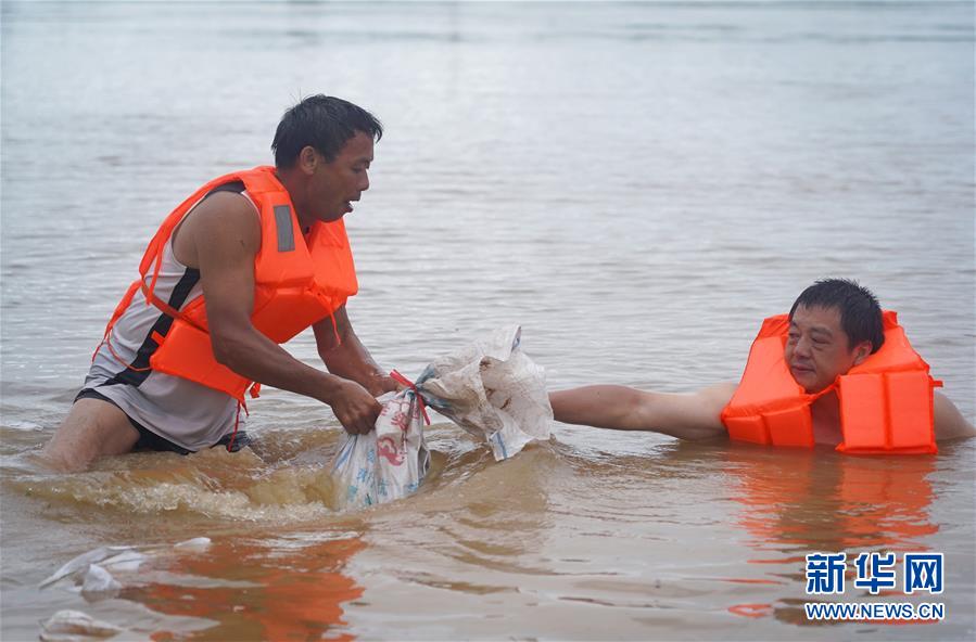 7月9日,邵忠如(前左二)和村民們裝填沙袋,封堵圩堤上的泡泉。新華社記者萬象攝