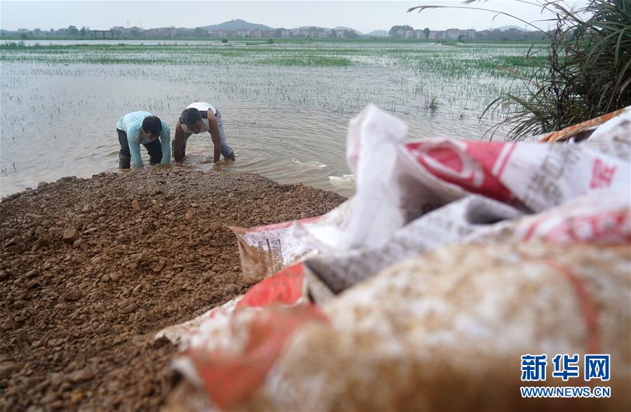 7月9日,邵忠如(右)和村民用沙袋封堵圩堤上的泡泉。新華社記者萬象攝