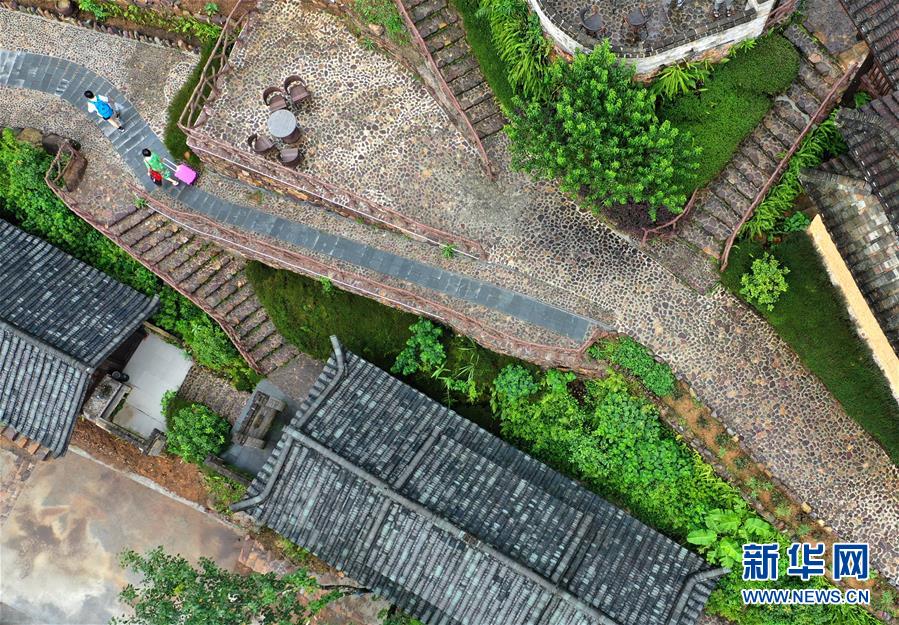 7月11日,游客行走在金秀瑤族自治縣六巷鄉(xiāng)一處民宿內(nèi)(無(wú)人機(jī)照片)。近年來(lái),廣西金秀瑤族自治縣依托當(dāng)?shù)刈匀簧鷳B(tài)優(yōu)勢(shì),圍繞境內(nèi)豐富的瑤族文化,大力發(fā)展鄉(xiāng)村旅游,精心打造一批獨(dú)具瑤族特色的山間民宿酒店,取得良好經(jīng)濟(jì)效益。新華社記者 周華 攝