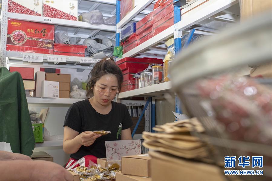 在位于新疆精河縣城的工作室內(nèi),朱虹美按網(wǎng)友訂單打包干果產(chǎn)品(7月11日攝)。新華社記者 胡虎虎 攝