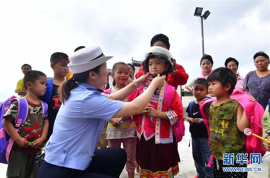 7月11日,柳州市交警支隊民警指導小朋友正確佩戴頭盔。當日,廣西柳州市交警支隊的民警來到融水苗族自治縣大浪鎮(zhèn)大新村紅鄧屯教學點,開展暑期交通安全教育活動,增強孩子們的安全出行意識。新華社記者黃孝邦攝