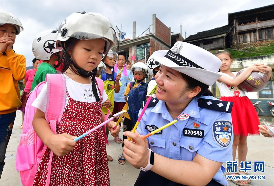 7月11日,柳州市交警支隊(duì)民警給小朋友贈(zèng)送交通標(biāo)志鉛筆。當(dāng)日,廣西柳州市交警支隊(duì)的民警來(lái)到融水苗族自治縣大浪鎮(zhèn)大新村紅鄧屯教學(xué)點(diǎn),開(kāi)展暑期交通安全教育活動(dòng),增強(qiáng)孩子們的安全出行意識(shí)。新華社記者黃孝邦攝