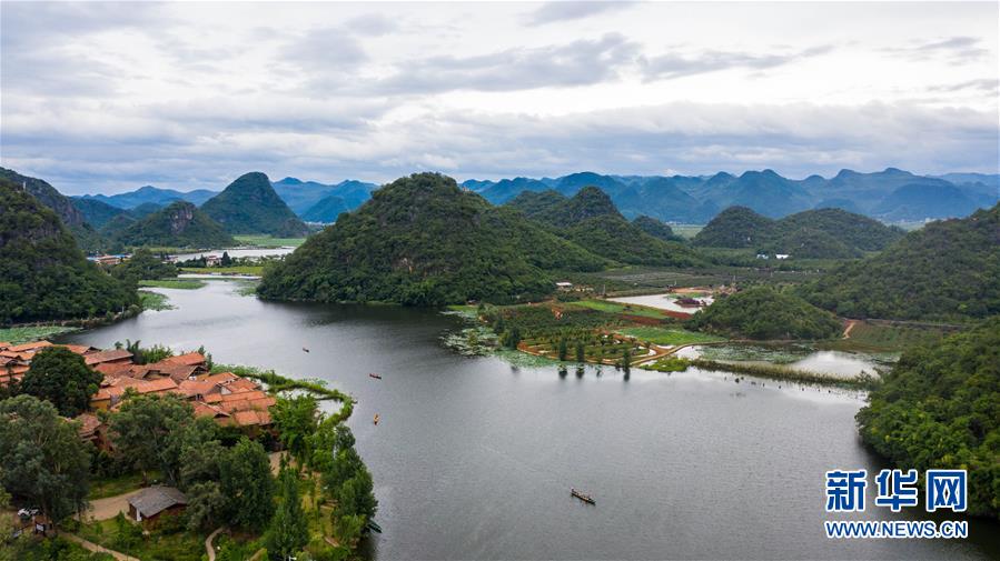游人在普者黑國家濕地公園泛舟賞景(7月10日攝,無人機照片)。新華社記者 胡超 攝