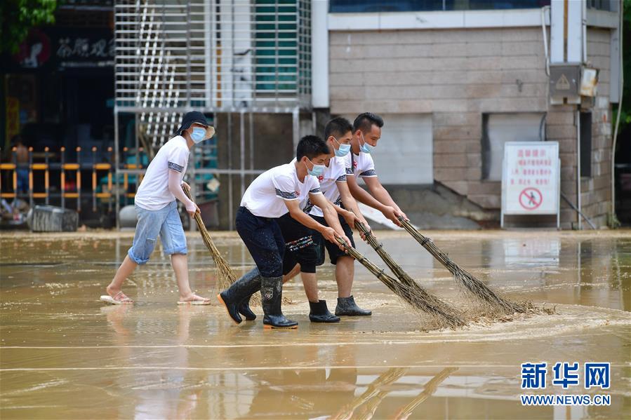 7月12日,融水苗族自治縣文化體育廣電和旅游局清淤小分隊(duì)在蘆笙廣場(chǎng)清理地面。當(dāng)日,在廣西柳州市融水苗族自治縣,融江洪水退去,當(dāng)?shù)叵嚓P(guān)部門組織多支清淤排險(xiǎn)小分隊(duì),積極開展災(zāi)后恢復(fù)工作。新華社記者 黃孝邦 攝