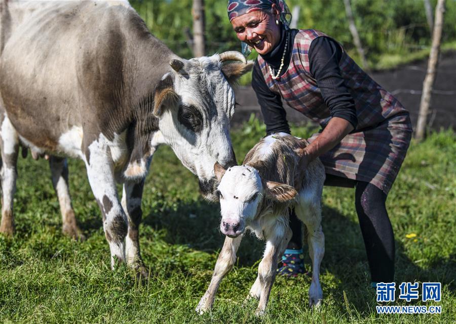 在新疆伊犁特克斯縣境內(nèi)的夏牧場(chǎng)里,一位牧民幫助剛剛出生的牛犢站起來(lái)(7月2日攝)。新華社記者 王菲 攝