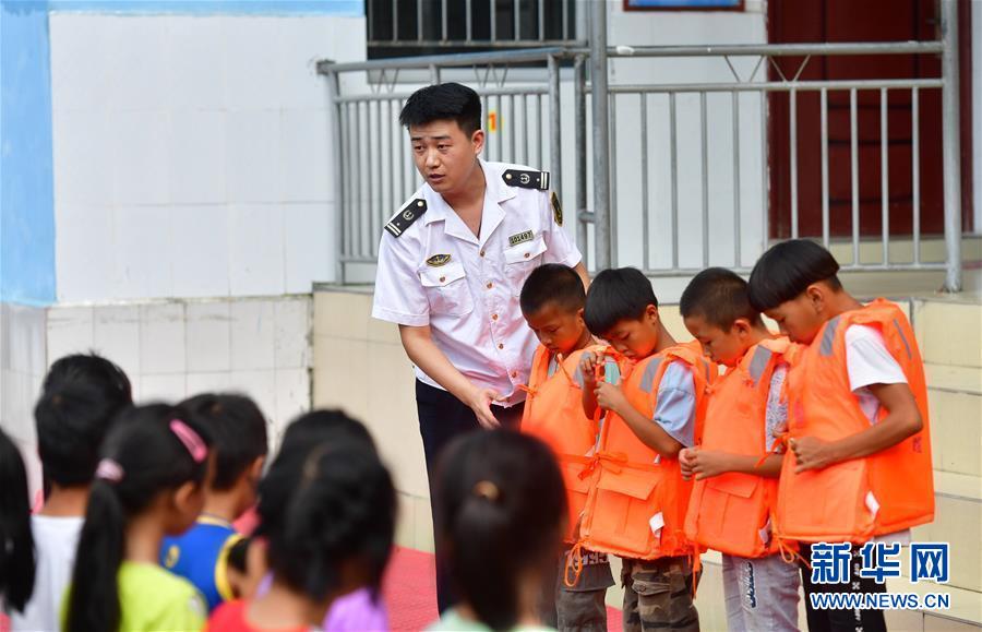 7月13日,在廣西融水苗族自治縣桿洞鄉(xiāng)黨鳩小學(xué),融水海事處工作人員指導(dǎo)學(xué)生穿救生衣。當(dāng)日,廣西柳州融水海事處在桿洞鄉(xiāng)黨鳩小學(xué)開展防溺水及水上交通安全知識教育活動,向?qū)W生們普及水上安全知識,并講解水上應(yīng)急救援技能。新華社記者 黃孝邦 攝
