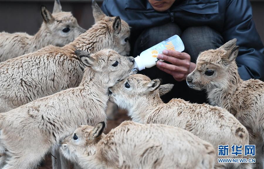 7月7日,三江源國家公園管理局長江源園區(qū)可可西里管理處卓乃湖保護站的工作人員才文多杰在給藏羚羊幼仔喂奶。新華社記者 薛玉斌 攝
