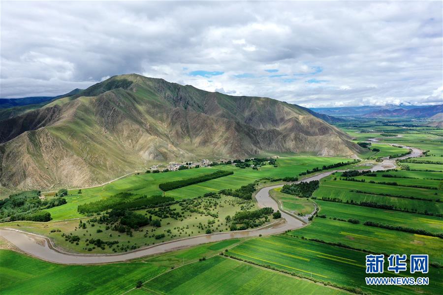 拉薩市林周縣邊交林鄉(xiāng)田園景色(7月14日攝,無人機(jī)照片)。林周縣地處西藏中部,拉薩河上游。夏日時(shí)節(jié),這里水草豐茂,綠意盎然,河流、村落、農(nóng)田組成一幅美麗的田園畫卷。新華社記者 詹彥 攝