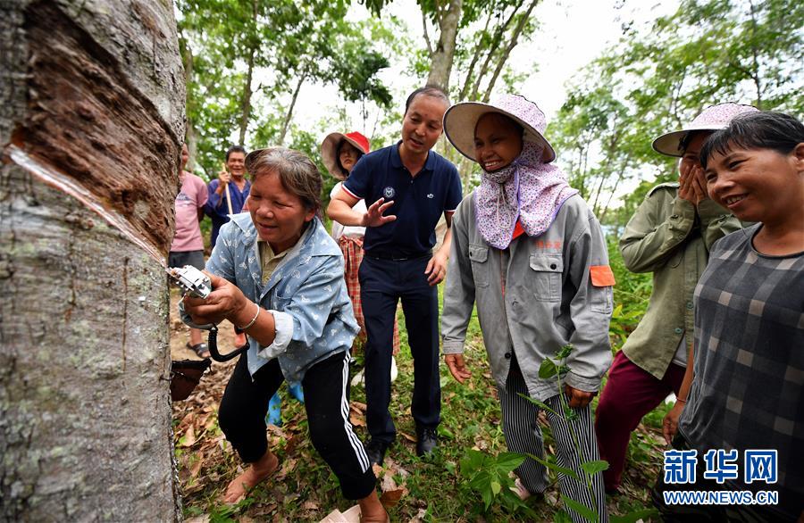 7月15日,瓊中縣什運鄉(xiāng)便文村貧困戶在技術(shù)人員指導(dǎo)下試用電動割膠刀。當日,海南瓊中黎族苗族自治縣什運鄉(xiāng)為542名貧困戶免費發(fā)放電動割膠刀,割膠刀研發(fā)單位為貧困戶提供使用技能培訓(xùn)。海南有著豐富的天然橡膠資源,但傳統(tǒng)膠刀的割膠技術(shù)要求高,農(nóng)民難以掌握,許多膠林閑置。電動割膠刀使割膠簡單易學(xué),幫助村民提高割膠效率,助力脫貧增收。新華社記者郭程攝
