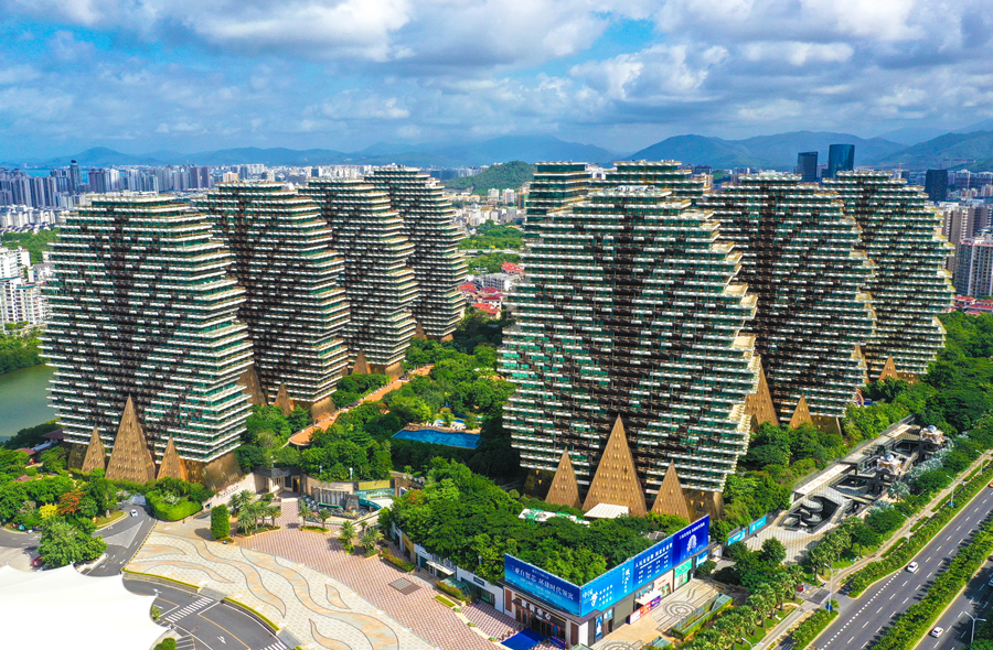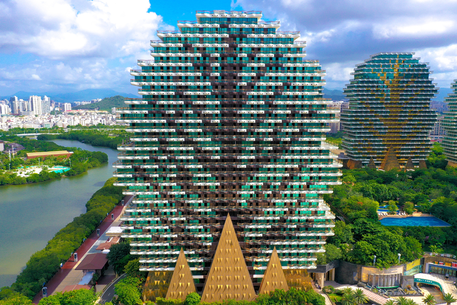 2020年7月20日,海南省三亞市,圖為航拍的“九棵大樹”建筑群,其具象性的建筑設(shè)計(jì)風(fēng)格,既有建筑之美,又見自然靈韻。