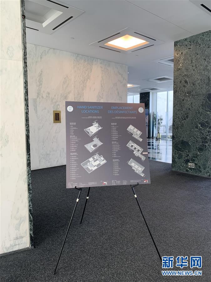 7月20日,在位于紐約的聯合國總部,秘書處大樓入口附近豎立著一塊標明消毒液擺放點的指示牌。受新冠疫情影響而實行遠程辦公4個多月的紐約聯合國總部20日進入重啟第一階段。按規(guī)定,該階段每天進入總部大樓人數不能超過400人。新華社記者王建剛攝