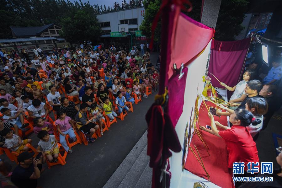 7月21日,和睦橋村的村民們?cè)谖幕Y堂觀(guān)看皮影戲表演。新華社記者徐昱攝