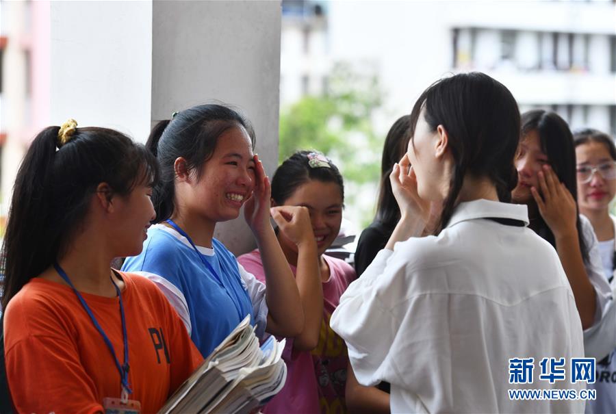 在融水苗族自治縣民族中學1818班舉辦的送別班會上,同學們與支教老師高潔(前右)道別(7月23日攝)。新華社記者黃孝邦攝