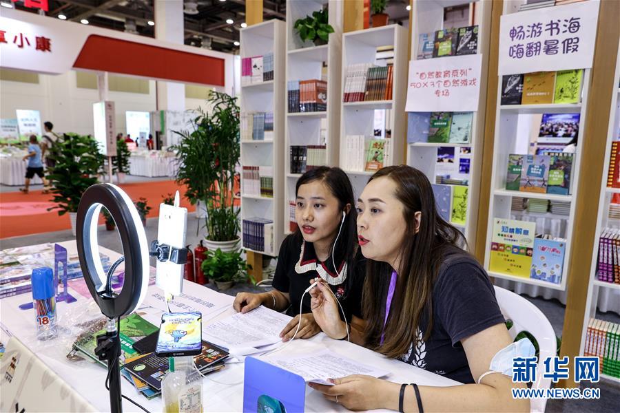 7月23日,兩位參展工作人員在網(wǎng)上直播介紹圖書。當(dāng)日,第十屆江蘇書展在江蘇蘇州開幕,400多家出版發(fā)行單位參展,吸引眾多讀者選購(gòu)圖書。新華社記者楊磊攝