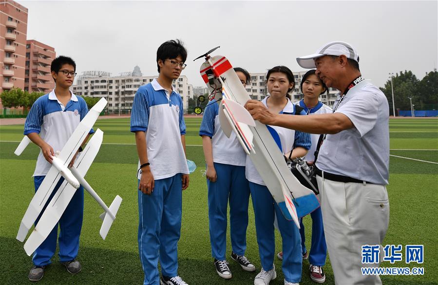 7月27日,老師在天津中學(xué)操場上給參加暑期實(shí)踐營的學(xué)生講解航模知識。新華社記者 李然 攝