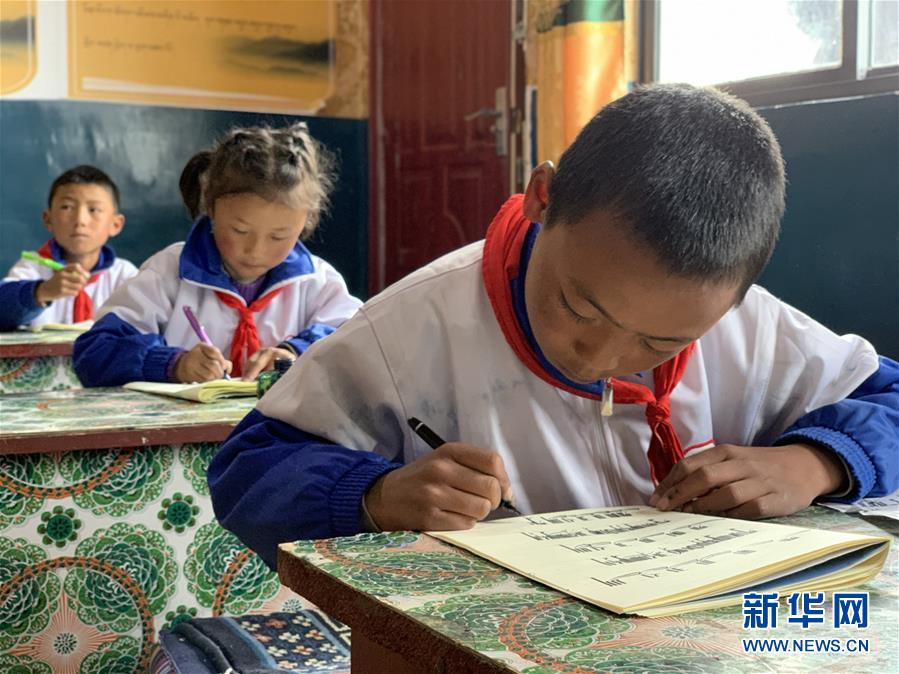 拉孜鄉(xiāng)中心小學(xué)學(xué)生在練習(xí)藏文書(shū)法(7月29日攝)。新華社記者唐弢攝