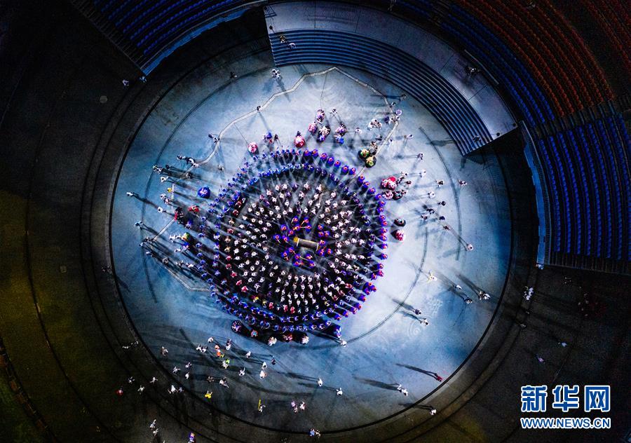 演員在苗族大型山水實景演出《西江盛典》中表演(7月30日攝,無人機(jī)照片)。新華社記者陶亮攝