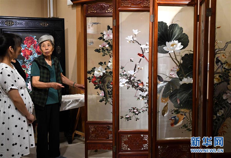 在開封市素花宋繡工藝有限公司的展示館里,王素花向徒弟講解自己刺繡作品上的針法(7月30日攝)。新華社記者李安攝