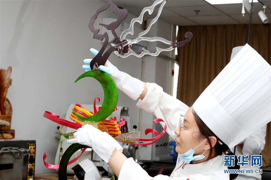 8月5日,參賽選手在創(chuàng)作航天主題的藝術(shù)面包。當(dāng)日,第二十一屆全國焙烤職業(yè)技能競賽上海賽區(qū)選拔賽,在上海市現(xiàn)代食品職業(yè)技能培訓(xùn)中心舉行,來自上海、江蘇、浙江等地的近60名焙烤行業(yè)技師,在藝術(shù)面包、傳統(tǒng)糕點(diǎn)、糖藝和藝術(shù)巧克力等項(xiàng)目中進(jìn)行比拼,在充滿焙烤香氣的賽場上展現(xiàn)技藝。新華社記者方喆攝