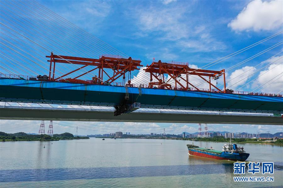 8月9日拍攝的廣州南沙港鐵路跨西江特大斜拉橋最后一塊鋼箱梁吊裝施工現(xiàn)場(chǎng)(無(wú)人機(jī)照片)。當(dāng)日,中鐵十一局承建的粵港澳大灣區(qū)基礎(chǔ)設(shè)施“硬聯(lián)通”重點(diǎn)工程——廣州南沙港鐵路跨西江特大斜拉橋完成最后一塊鋼箱梁吊裝作業(yè),大橋即將合龍。該橋位于廣東佛山市和江門(mén)市交界處,全長(zhǎng)1117.5米。新華社記者劉大偉攝。