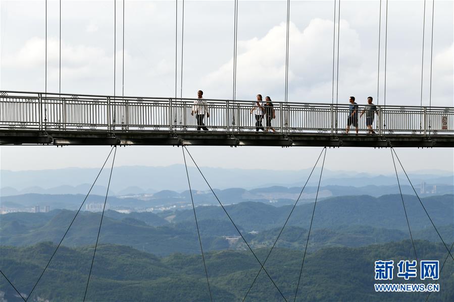 8月8日,游客在貴州省龍里油畫大草原的吊橋上觀光。近日,貴州省黔南布依族苗族自治州龍里縣境內(nèi)氣候宜人,龍里油畫大草原、“龍門鎮(zhèn)”武俠文化主題景區(qū)等景點(diǎn)吸引眾多游客前來觀光旅游。新華社記者楊文斌攝。