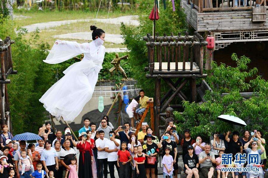 8月8日,游客在貴州省龍里縣“龍門鎮(zhèn)”武俠文化主題景區(qū)觀看武俠劇表演。近日,貴州省黔南布依族苗族自治州龍里縣境內(nèi)氣候宜人,龍里油畫大草原、“龍門鎮(zhèn)”武俠文化主題景區(qū)等景點(diǎn)吸引眾多游客前來(lái)觀光旅游。新華社記者楊文斌攝。
