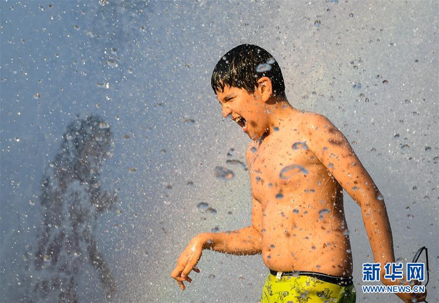 8月8日,一名兒童在德國(guó)法蘭克福一處噴泉內(nèi)戲水。 當(dāng)日,法蘭克福遭遇高溫天氣,最高氣溫達(dá)37攝氏度。 新華社記者 逯陽(yáng) 攝