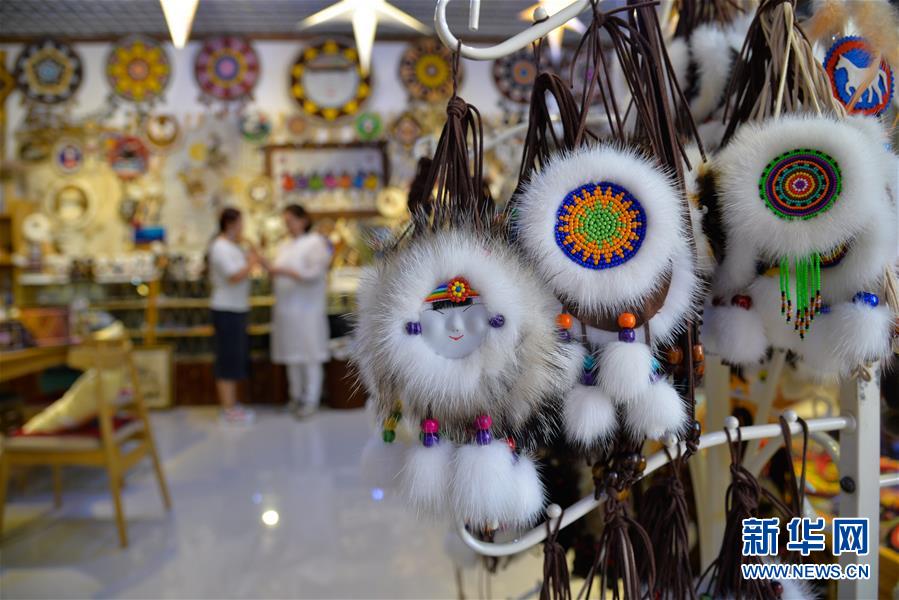 這是在內蒙古自治區(qū)鄂溫克族自治旗巴彥托海鎮(zhèn)太陽花傳承發(fā)展中心展示的“太陽花”產品(8月7日攝)。新華社記者徐欽攝。