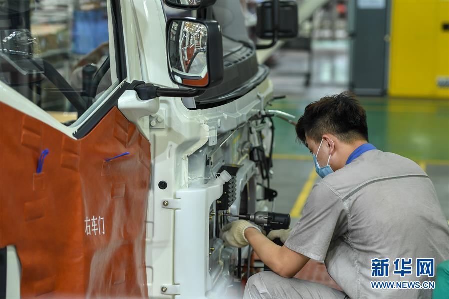 8月10日,在位于長(zhǎng)春市的一汽解放總裝車間,工人在裝配車輛。中國(guó)第一汽車集團(tuán)有限公司7月銷售整車32.2萬(wàn)輛,同比增長(zhǎng)23.2%,延續(xù)上半年的增長(zhǎng)態(tài)勢(shì)。新華社記者張楠攝。