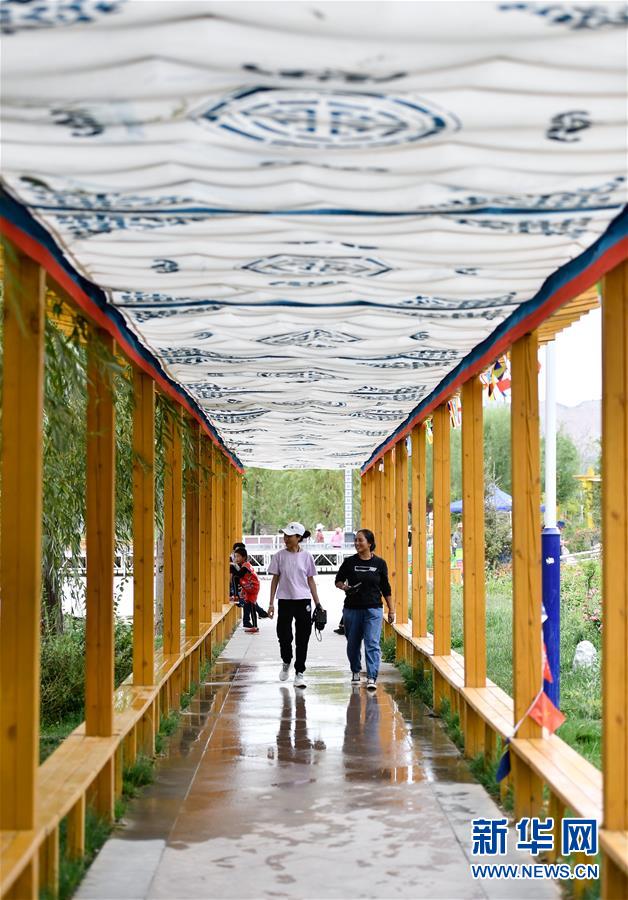 8月11日,游客在尖扎縣昂拉鄉(xiāng)德吉村景觀長廊內(nèi)游玩。新華社記者張龍攝