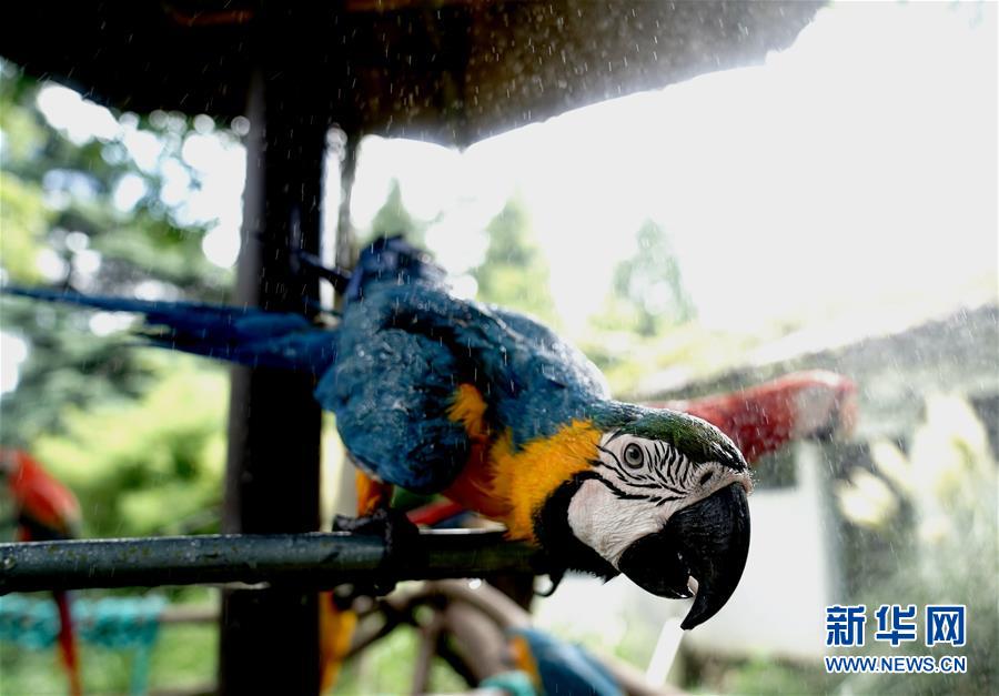 8月11日,上海動物園的金剛鸚鵡在享受噴淋降溫。當(dāng)日,上海最高溫度達到35攝氏度,上海動物園開啟園內(nèi)安裝的各種噴淋裝置,讓動物們防暑降溫,樂享清涼。新華社記者張建松攝
