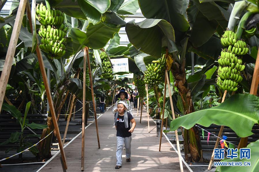 在吉林省永吉縣萬昌鎮(zhèn)宇豐紅果木瓜產(chǎn)業(yè)園,游客與大棚內(nèi)的香蕉合影留念(8月12日攝)。新華社記者 許暢 攝