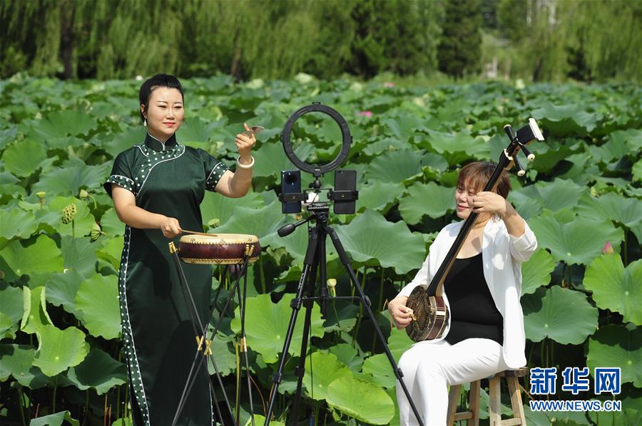 8月13日,河北省河間市西河大鼓非遺項(xiàng)目藝人李雪(左)、張領(lǐng)娣通過網(wǎng)絡(luò)直播表演西河大鼓。暑假期間,河北省河間市文化館推出非遺展演“云端”播系列活動(dòng),組織當(dāng)?shù)匚骱哟蠊姆沁z項(xiàng)目傳承人利用視頻直播的方式進(jìn)行線上展演,通過“云端”傳承非遺文化。新華社記者朱旭東攝