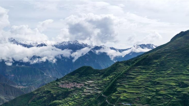 雨后,甘肅省甘南藏族自治州舟曲縣境內(nèi)的岷山上云霧升騰,山巒若隱若現(xiàn),宛如仙境。