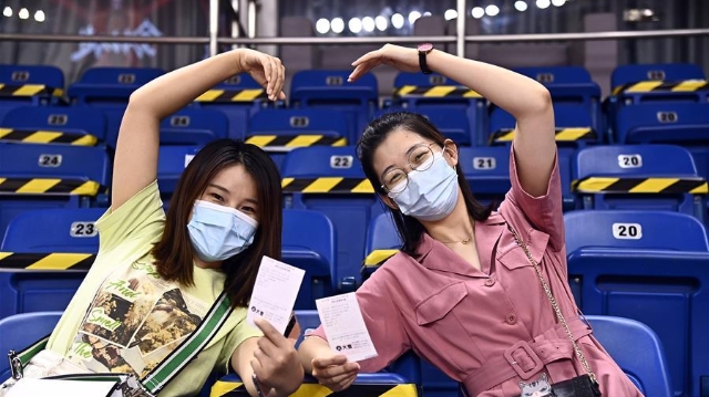 7月26日,在山東青島舉行的2019-2020賽季中國男子籃球職業(yè)聯(lián)賽(CBA)復(fù)賽第二階段(嶗山賽區(qū))比賽中,醫(yī)護(hù)人員、教師、公安戰(zhàn)線人士通過官方購票平臺,完成包括核酸檢測在內(nèi)的相關(guān)流程后進(jìn)場觀看了上海久事隊(duì)迎戰(zhàn)山東西王隊(duì)的比賽。 觀賽期間,觀賽者須全程佩戴口罩,對號入座,嚴(yán)格保持間隔一米就座。退場時,觀眾須按照自后向前、先兩邊后中間的順序,保持“一米線”社交距離有序退場。