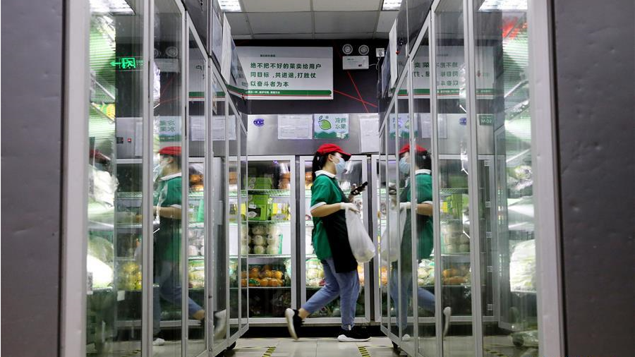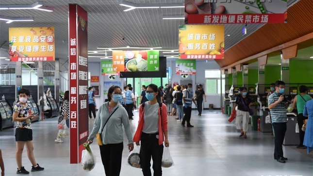 工作人員在新發(fā)地批發(fā)市場(chǎng)周轉(zhuǎn)新區(qū)對(duì)進(jìn)場(chǎng)車輛進(jìn)行取樣。