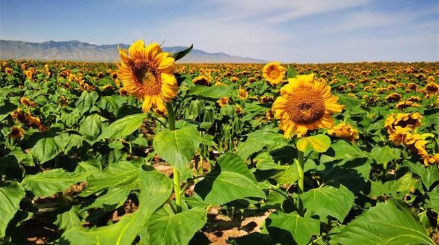 初秋時(shí)節(jié),位于甘肅省白銀市景泰縣寺灘鄉(xiāng)的十萬畝向日葵競(jìng)相綻放,金黃的葵花張開“笑臉”,迎接豐收。