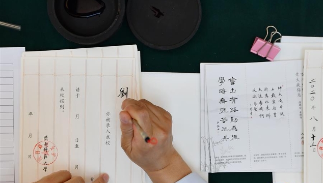 今年,學(xué)校十余位退休教師、在職教師、校友代表等書法愛好者將為約4500名新錄取的本科生送上帶著墨香的大學(xué)錄取通知書。