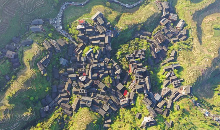 這是3月29日無(wú)人機(jī)拍攝的廣西融水苗族自治縣桿洞鄉(xiāng)黨鳩村的田園春色。