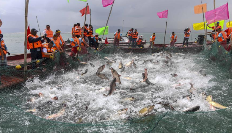 2019年7月9日,漁民們在江蘇連云港沿海地區(qū)海邊的灘涂上將剛收獲的海蟶運送上岸裝箱外運。