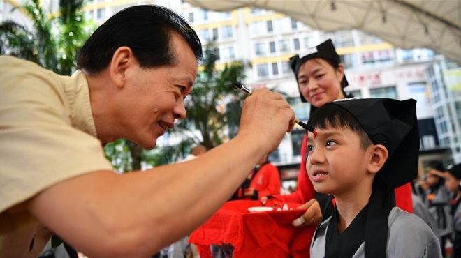 海口胡畫少兒藝術(shù)中心為500名小朋友舉行“開筆禮”,通過“點朱砂,啟智慧”“習(xí)書法,描人字”等儀式讓孩子們體驗中國傳統(tǒng)文化。