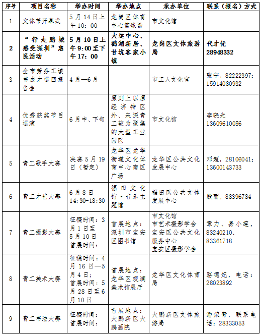 活動期間,全市將舉辦25項全市性重要活動,分為6項活動,19項比賽。其中,6項活動為開幕式、“行走鵬城 感受深圳”惠民活動、全市勞務(wù)工讀書成才巡回報告會、來深青工文體節(jié)回顧圖片展、閉幕式及優(yōu)秀獲獎節(jié)目展演;19項比賽活動分別是來深青工歌手大賽(全國)、才藝大賽、攝影大賽(全國)、美術(shù)大賽、書法大賽、知識競賽、演講比賽、打工文學大賽(全國)、羽毛球混合團體賽、跳繩比賽、乒乓球競賽、趣味體育比賽、拔河比賽、三人籃球賽、業(yè)余定向賽競賽、登山比賽、棋類挑戰(zhàn)賽、趣味沙灘排球比賽、廣場健身操比賽。參賽對象主要為在深工作的18至50歲非深戶籍人士(不包括在各類文化演藝公司、培訓機構(gòu)中從事文藝表演、培訓的專業(yè)人員)。