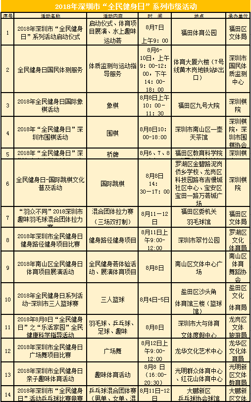 “今年市里將推出14項(xiàng)市級(jí)活動(dòng),各區(qū)也因地制宜推出了特色活動(dòng)。”深圳市文體旅游局群體處處長(zhǎng)謝汝成說道。
